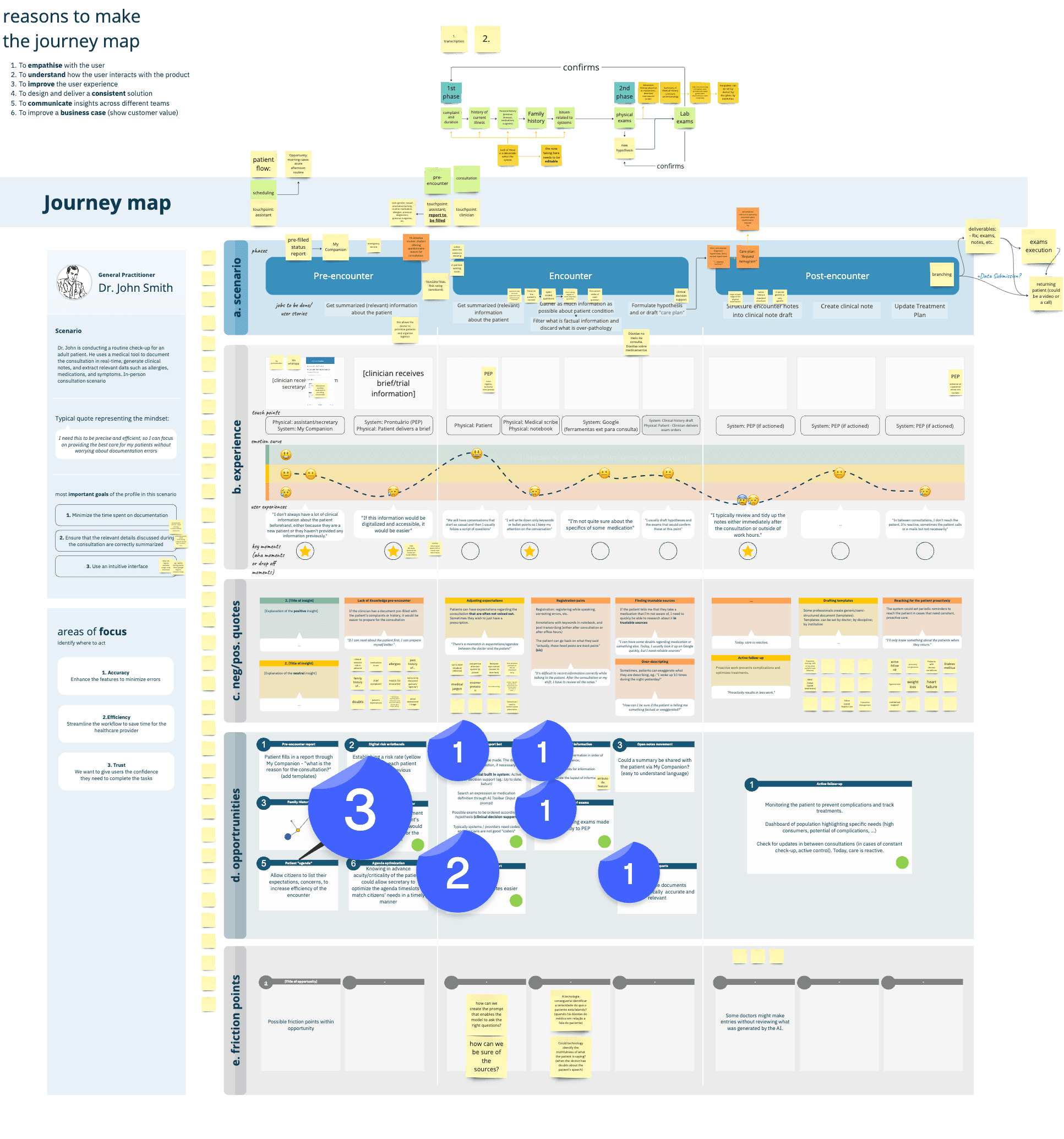 We had the opportunity to collaborate with stakeholders and users on defining the typical journey a clinician would go through when consulting whit a patient. We captured typical quotes and experiences that this clinician would say/have during the moment. From there, we were able to capture the key insights and opportunities for the flow. For instance, providing a pre-filled document with the patient's history would allow the clinician to prepare for the consultation, increasing the efficiency of the encounter.