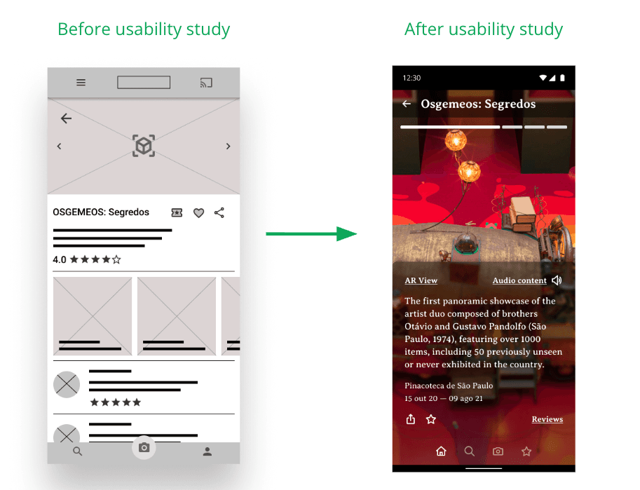 The initial exhibit detail page included ratings, reviews, and multiple media thumbnails alongside the main content. Post-usability study, this was streamlined to focus the experience on the exhibit itself, with “AR View” and “Audio Content” as the primary interactive elements, and ancillary content like reviews surfaced through a clearly labeled link.