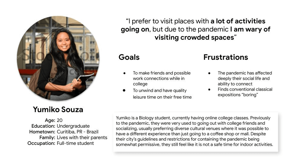 Five participants were interviewed remotely to uncover pain points and gather insights around museum visitation. Participants were selected based on a profile of regular museum-goers who incorporated cultural visits into their social lives.