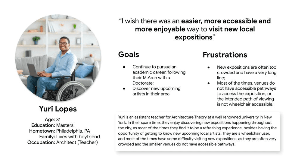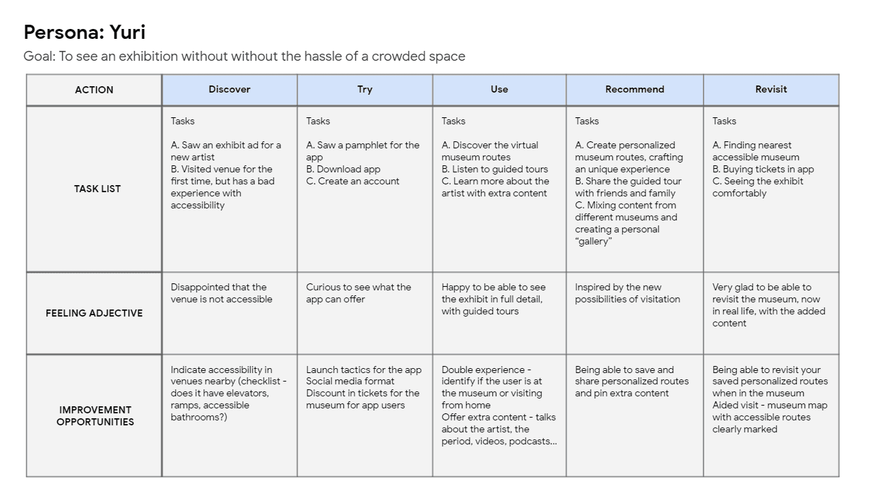 A journey map was built around Persona Yuri, tracking the experience of trying to see an exhibition without the hassle of a crowded, inaccessible space. The map traced five key stages: