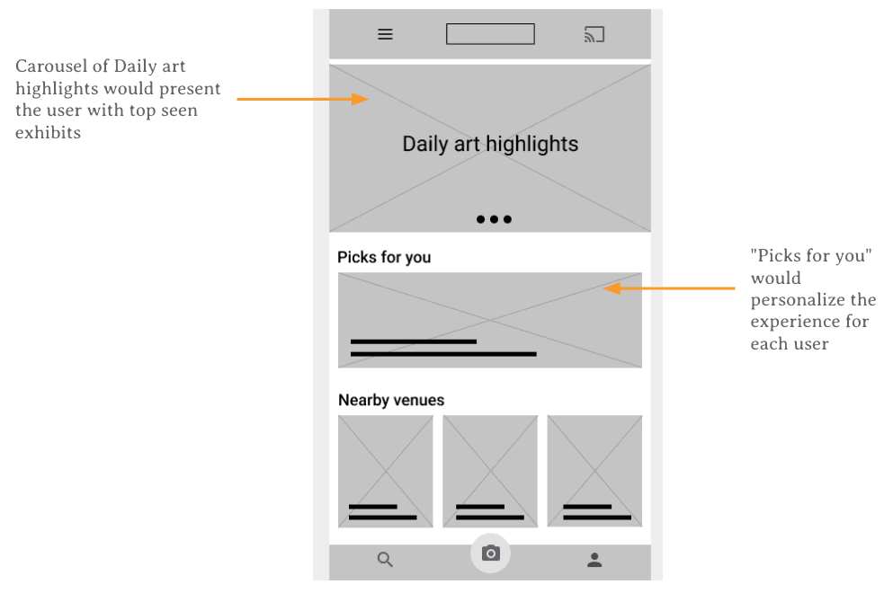 Key wireframe features included a carousel of daily art highlights (top-seen exhibits), a “Picks for You” personalized content section, and a “Nearby Venues” grid that surfaced geographically relevant content.